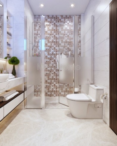 Trong thiết kế này, việc thiết kế phòng tắm đứng sẽ đem lại cho căn phòng bố cục hài hòa hơn. Cũng như việc sử dụng các tấm kính cường lực để tạo vách ngăn, phân chia không gian. Ánh sáng sẽ vẫn chiếc sáng đồng đều cho cả căn phòng.