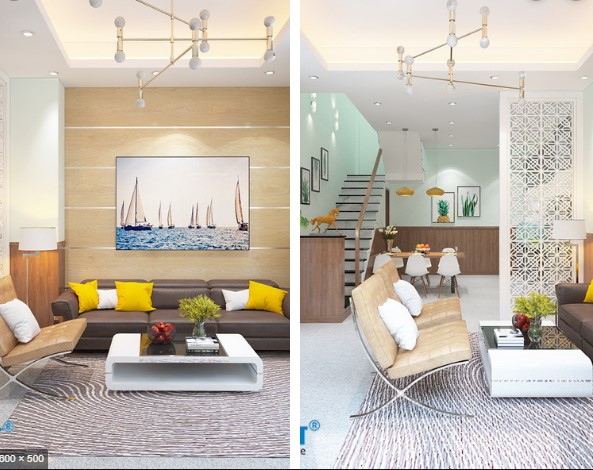 Những chiếc đèn trần, đồ nội thất phòng khách, vật dụng trang trí như khung gương, khung tranh treo tường sẽ khiến cho không gian trở nên nổi bật hơn.