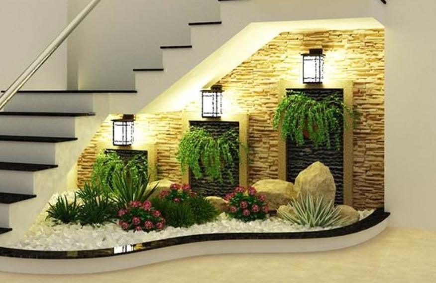 Vị trí tầng trệt: Những khu vườn ở vị trí này có thể là một hòn non bộ bên dưới đáy của giếng trời, hay có thể là bao quanh căn nhà và được liên kết với nội thất bên trong bằng thiết kế kính cường lực.
